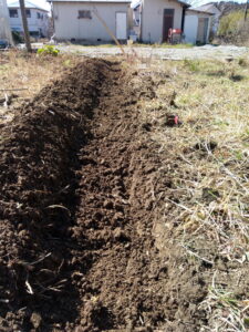右: 他人様には分かるまい、軍手と下着の背中の汗が物語る深さ10㎝一寸の溝です。一応、端から端までやりました。萱の根の塊はしぶとい、しぶとい!今後は水糸の右側を60㎝ばかり今と同じ作業をしていきます。その時掘った土は畝の右側へ置き、今の溝はもっと掘って行き、その土は今度作る畝の表土になります。