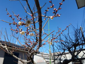 今朝、実梅の花が増えて7つになっていました。遠目ですが西隣さんの梅も咲き出したかな?