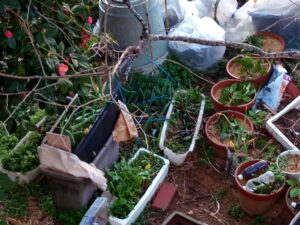 手前の発泡スチロールは底が抜いてあります。少し高くなっていますが、土中へ根が直接入れます。また、蕪の種蒔きもしましょう。葱の肥料は落ち葉と萱です。椿の花も落ちています。芍薬の鉢の上にあるのは芯止めした侘び椿の小枝です。