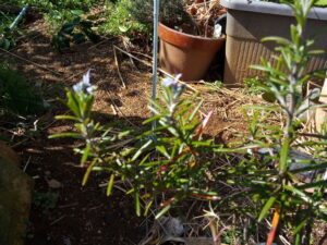 玄関前から庭に鉢のまま移したローズマリーが咲き始めました。ブルーの花だから東の光が好きな筈ですが、初めてなので、私はドキドキ。