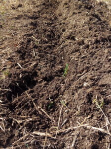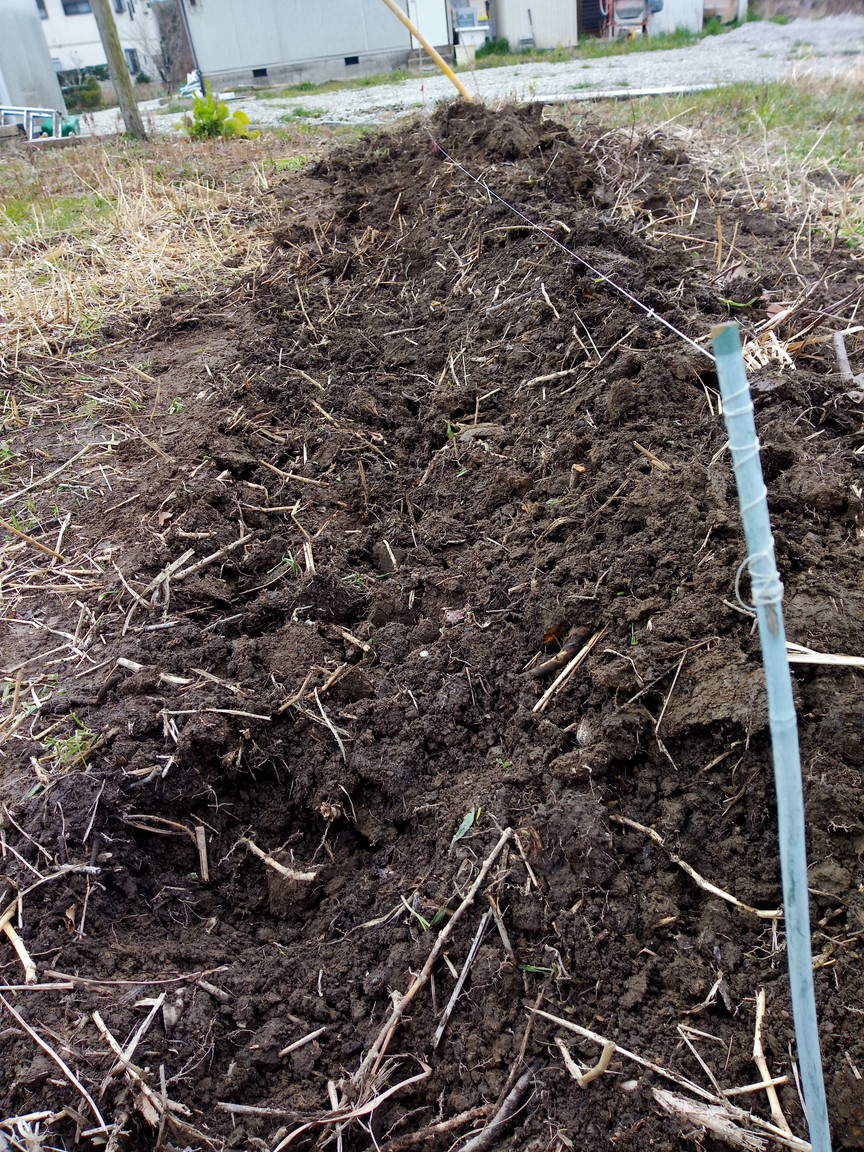 畝の隣に溝を掘り、その土を出来た畝の上に置きようやく剪定枝や萱が隠れてきました。雨が降ればシルト土(田んぼの土)でも幾分柔らかくなります。其処を狙ってスコップを入れます。スコップは入るけれど、全体重をかけても掬えるのはホンの少し。