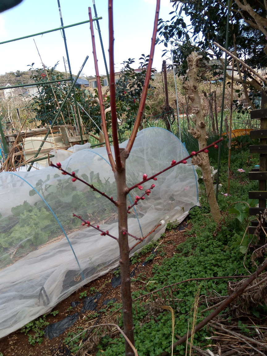 今日届いた豊後梅は可愛い蕾を着けた1.1mの背丈。上部に三本の垂直枝に近いふと枝があり、下の枝葉蕾を着けています。我が家の実梅も豊後の筈だけど、親木よりは蕾も花も白いです。私が東京のアパートから真下に見える親木を見ていた時はほんわりとした薄紅の花びらでした。その木から取れた実生の梅なので、別の木の遺伝子が混ざっているのかもしれません。