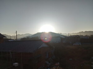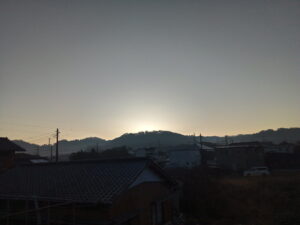 日が昇る前は浅間山のかなり北よりに光輪がありますが、上がって来ると真ん中辺です。