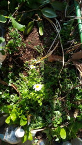 右: 玄関アプローチのプランターで育てたノースポールを畝へ定植しました。