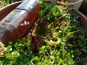 左: これは都忘れの鉢です。刈草を足したから、どれが都忘れか分からなくなりました。今日は目につく草はみんな刈って敷いています。
