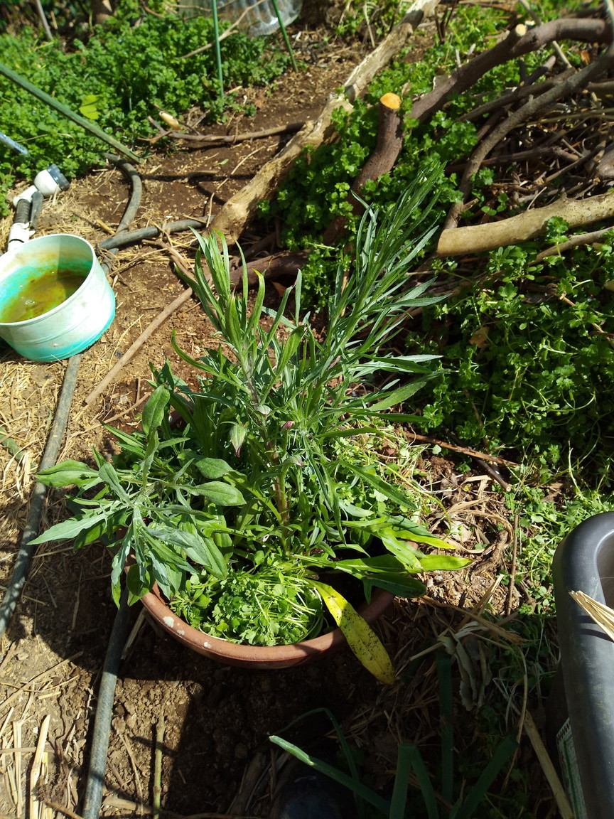 左: これは都忘れの鉢です。刈草を足したから、どれが都忘れか分からなくなりました。今日は目につく草はみんな刈って敷いています。