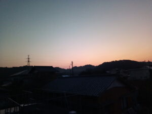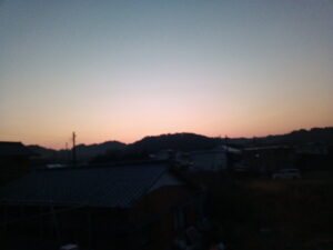 6時半過ぎ、柔らかな日差しが窓辺に届きました。今朝の日の出は6時。晴れているから30分で山の上から太陽が