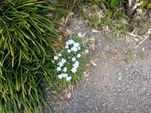 左: 玄関アプローチのサルビアストラータの芽が出ました。1.5年草ですが、零れ種で毎年現れます。