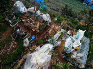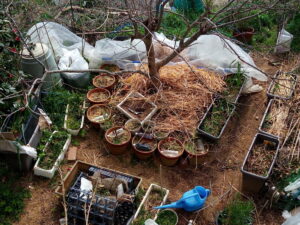 右: 大西条柿の根本にある萱は元第二堆肥枠に防寒材で入っていた物です。たっぷりありました。笑 秋にこういう資材を蓄えて置く場所が欲しいなぁ。夏蜜柑下ですね。