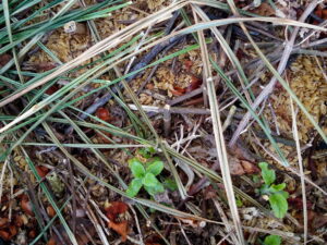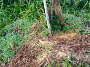 右: 南西にある柿の木の根元です。いい感じです。積み重ねた草などに新たな草が生えて来ています。この草も伸びてきたら刈ってこの場において下さいね。