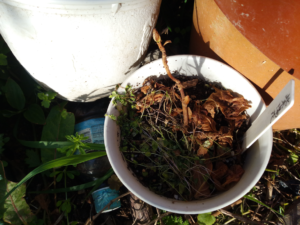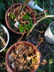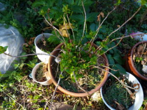 右: こちらの二鉢はその挿し木です。5本ずつ挿してあります。独立させようかなぁ。