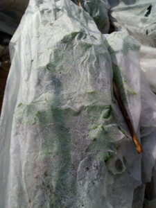 右: キョン除けの不織布を被っているので見えませんが、今朝は夜露が随分降りたみたいです。中に居るのは庭の大根で既に花が上がって来ました。もうじき種取用耐病巣太り2-3本残して大根は抜いてしまいます。