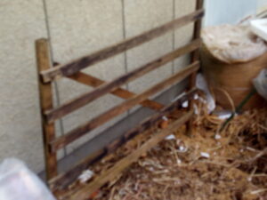左: 外壁に沿って背の部分を建てました。以前作った時には筋交い入れてないからぐらぐらの細い材でした。今回は確り庭に転がっていた木材を打ち付けました。足元は虫に喰われていたから1年位で作り直しです。