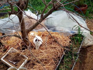 今日はキョンの食害はありませんでした。少なくとも法地から入った形跡はありませんでした。7時前は寒いから猫達は発泡スチロールの上ではっちゃんとクロスケがくっつき合って温もっていました。地面からの湿気と冷えを受けずに寝られる場所と日向ぼっこできる場所、ガ猫達の要望でしょう。9時になると活動で猫達は外出するでしょうから、その頃に第二堆肥枠を設置しましょう。