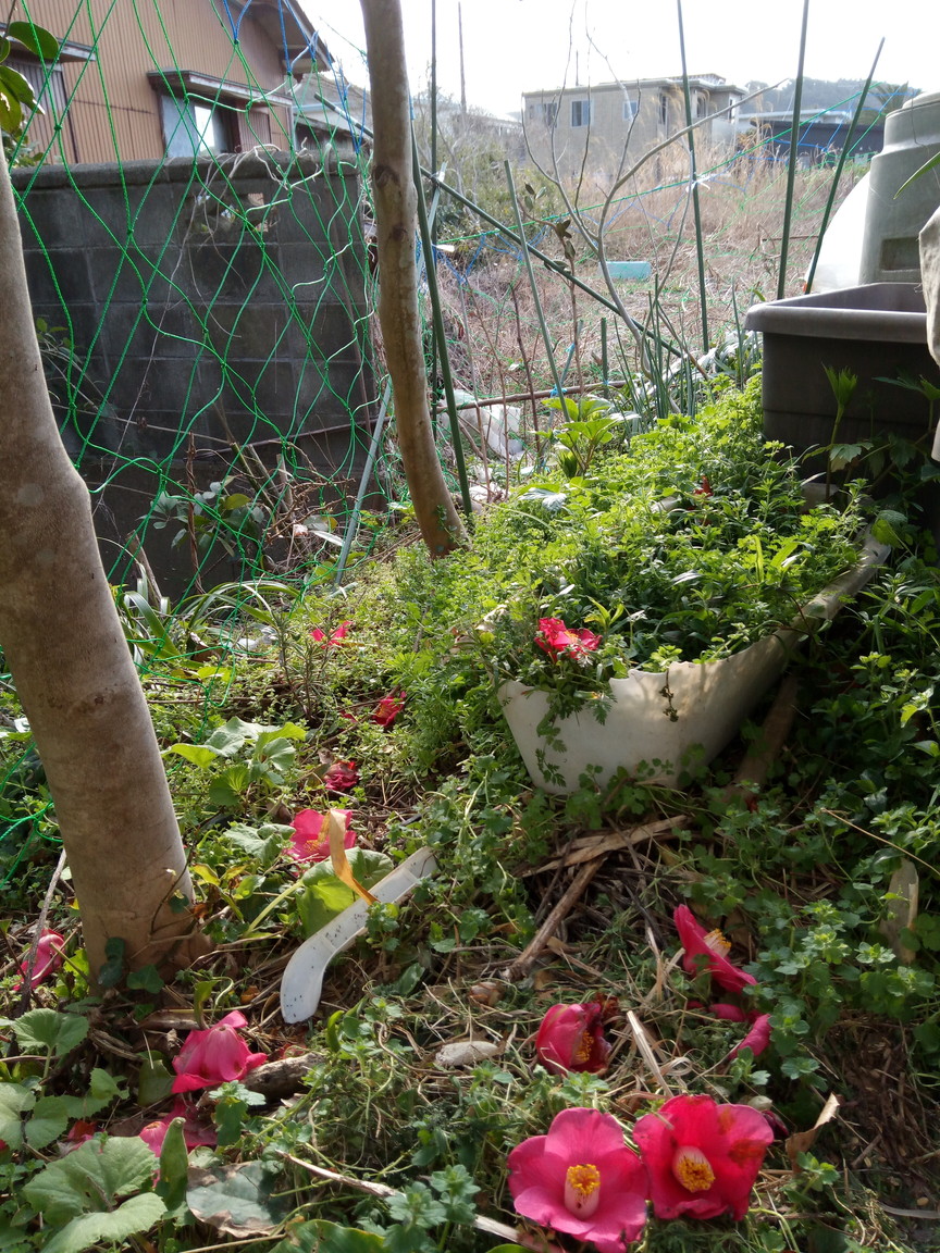 左: 水遣りをして根本をイヌノフグリで覆った豊後梅です。豊後梅さんの向こうにあるのは東京の日商岩井マンションの管理人さんから貰った黄色い菊です。旺盛なので、根本に広がって呉れるでしょう。