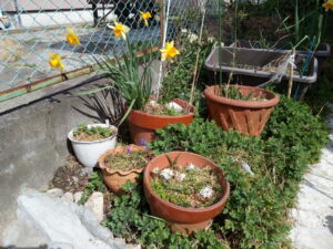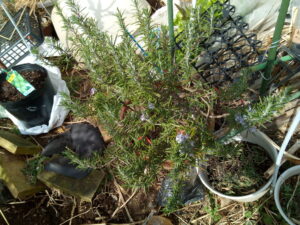 玄関アプローチから移した鉢植えのローズマリーには花が見られます。花芽分化の時期に庭に移して上げられれば、東の交戦を浴びてもっとたくさんの花を着けた事でしょう。次の秋が楽しみです。花が終えたら挿し木をします。20本以上やってもOKですね。
