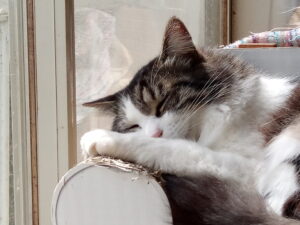 『僕は雄だけど、未だ大人じゃないんだ。人間で言ったら高校生くらいかなぁ。ここ数日、恋猫は落ち着いて、僕も午前中のまどろみを楽しんでいるんだよ。乾いた枯葉が良い匂いだ…。」
