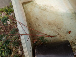 頂いて来ました。念のため、2音。手前に見えるのが豊後梅さんの入っていた鉢です。切り裂いたけれど、テープ止めして使わせてもらいましょう。一時間浸水です。木だから2-3時間浸水した方が良いかな。