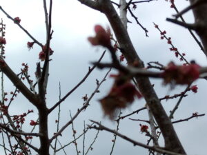 左: 今の時期でも、10時半で梅の2-4枝の先にようやく日が当たり始めます。
