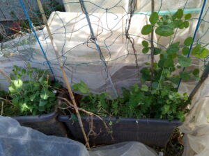 籾殻袋一杯です。少し広げて見たけれどドサッと多い!既に2日位経っていますからね。中はジャガイモのプランターです。右のトウモロコシを蒔いたところにも入れました。
