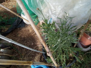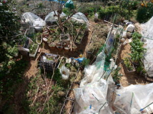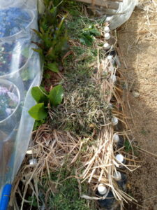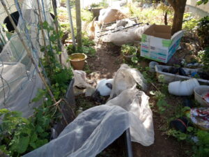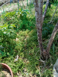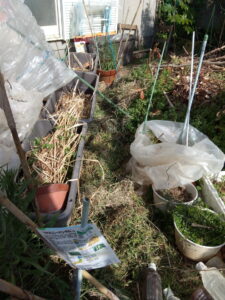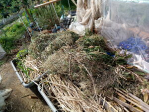 中: 二畝南の西側にも敷いて、花も野菜も敷き草、敷き草!