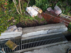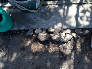 右: 二度打ちました。後1-2度打ってから石を乗せたいですね。白躑躅下土留めは石を乗せて後ろ側に赤玉を入れて完了です。出したもカチオンシーラーを塗って盛りますが、その前に段ボールの収集準備を致します。