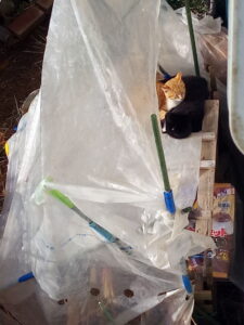 今日は日刺しが強い、とトラ子は段ボールベッドの中へ。うめも日陰へ避難しました。