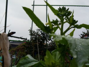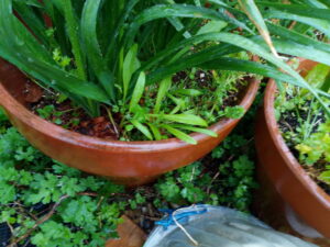 左: 玄関前の零れ種のヤグルマギク。水仙の跡、花を見せてくれるでしょうか。