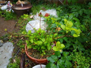 中: ピンクの紫陽花の親株。丸葉が可愛い。