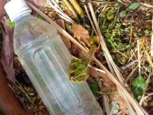 右: レモンマリゴールドタラゴンの新芽。どの植物も刈草マルチバ万能です。