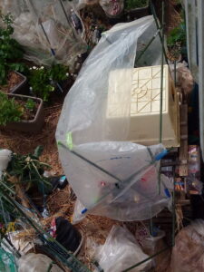 ちゃーちゃんが来たので、カリカリ+トロミを一匙掛けて渡して来ました。猫小屋ルーフのプラスチックの箱は強風にあおられた農ビで地面に落とされました。支柱に横桟を入れて風の煽りを考慮して農ビを巻来ましょう。