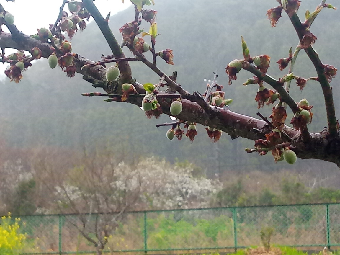 実梅には緑色の可愛い梅が、その向こうには雨に煙った山桜です。