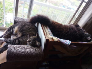 福もトラ子も暖かいから廊下で寝ています。一階ではクロスケ、ナガ君、はっちゃん、そっくりちゃんまで入って雨避けをしていました。肌寒いんだよね。1-2時間、一階で寛いだ後は自主的に出て行きました。クロスケもそっくりちゃんも雨宿りをしていました。残ったのはナガ君で、一猫で寝ています。彼は寒い時、雨の時、一階で夜を過ごしています。