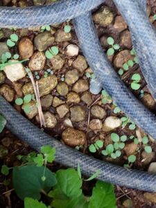 左: ホースが放り出している処に発芽した紫蘇やら何やら!