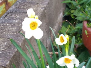 中&右: 日本水仙。中が西隣さんの物。右が我が家の鉢植え。