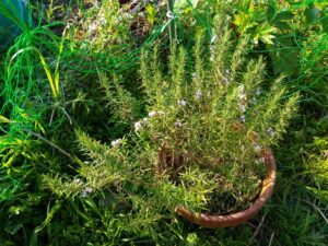 右: キョン網の際に置いたローズマリーは東の光をたっぷり浴びて花を沢山着けています。