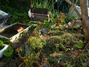 白躑躅下の土留めは出来たけれど、土を入れていないので、取り敢えず草を重ねて入れて行く事にしました。未だ赤玉土を入れようと思っていたのが数時間前です。しかし、土とそこに植えられた植物のコラボで土を作って行くのなら草から作るのが一番手っ取り早いです。