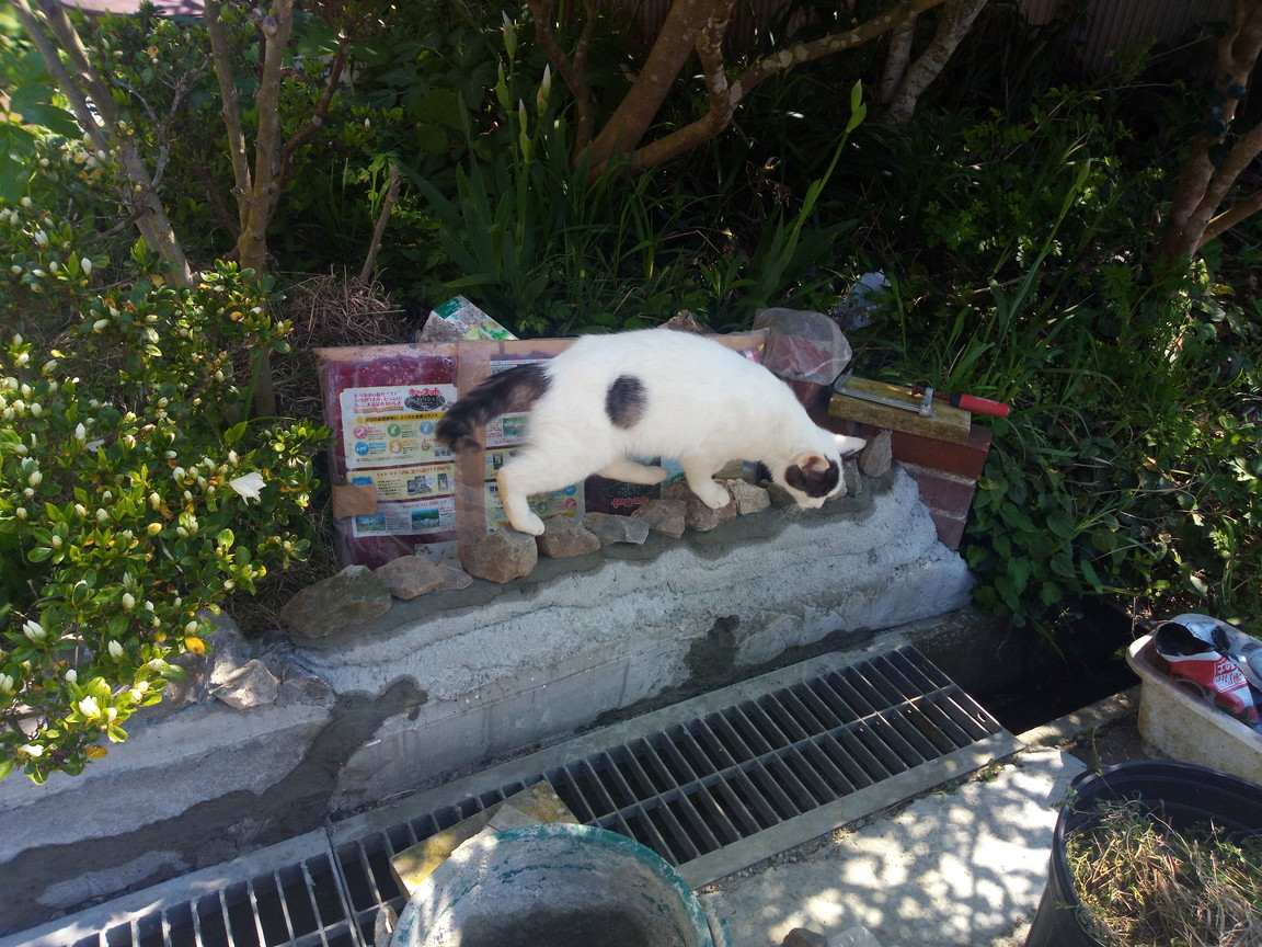 11時、ちゃーちゃんがやって来ました。モルタルごっこをしていたので、少し待たせてしまった。表に行って”ちゃーちゃん、ご飯だよ!”、と呼ぶと小走りに走って来ました。一階でカリカリにある程度の栄養を取らせないといかんでしょう、とパテと使いかけのとろみを載せると静かに食べて居ました。私はモルタルごっこに戻って仕上げをしていると、ちゃーちゃんが出て来て、私の横を通るときにニャハハン、と言って帰って行きました。『ご馳走様、助かります。』かな?此処の処で、ちゃーちゃんとはずいぶん意志の疎通ができるようになって来た。不思議なもんで図々しい雌猫が何故か可愛く見えてきた。アニャ、アニャ!騙されちゃいかんぞ~!