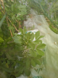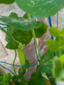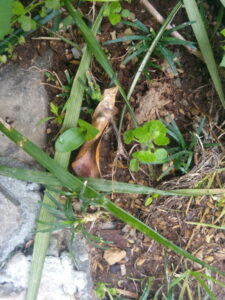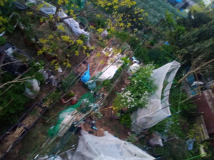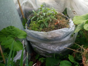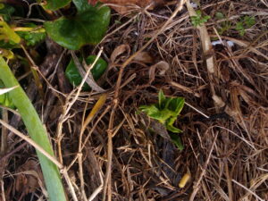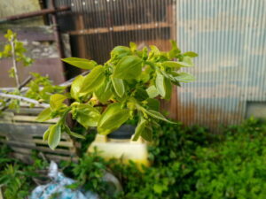 左: 庭のプランターに今年の冬に植えた鹿児島県産のジャガイモじゃないかなぁ。このプランターには長崎県産も植えてあるのですが、どうやら長崎県産は発芽抑制剤が掛かっていたみたいで、発芽をしませんでした。それでもストロンだか根だかを出していましたので、そのままにしました。