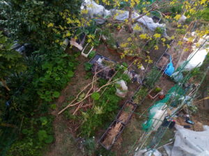 18時半になっても猫達は外で遊んでいます。福とうめは西隣さんのスロープで、クロスケは畝の上の刈草で休んでいます。