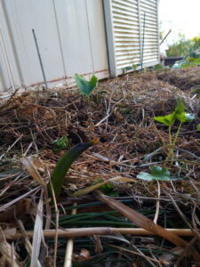 植えっぱなしの里芋が発芽して来ましたが、もう一本昨日出て来ましたよ。萱や草マルチの力は大きいです!里芋のような熱帯系が根を動かさないと本当に早い。きっと根だけでなく、微生物も温存出来たからなんでしょうね。
