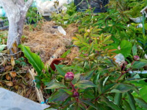 中: 脇の通路の二番目の里芋の発芽です。中央やや左で黒い筒みたいに見えます。緑の葉っぱは展開していません。