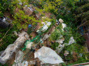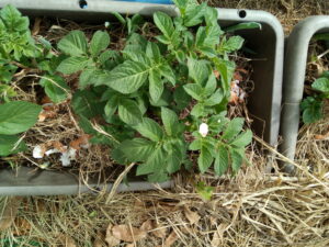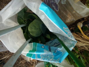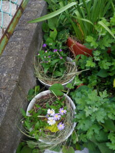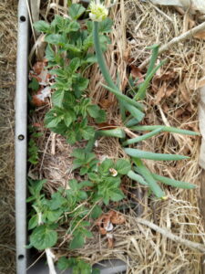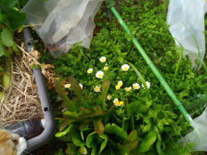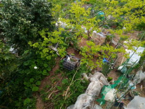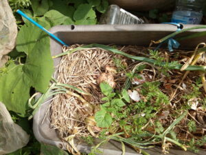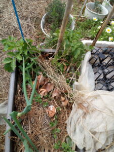 サフィニアパープルをプランターに植え換え、弾ポールをもう一本1600㎜を足してネット空間を広くしました。今年はパンジーも花を摘まず、そのまま結実させています。今年の秋に向かってどのようになるでしょう。パンジーの枯れた部分だけ切って残渣はマルチに載せて行きます。今は籾殻マルチですが、草マルチも入れて行きます。