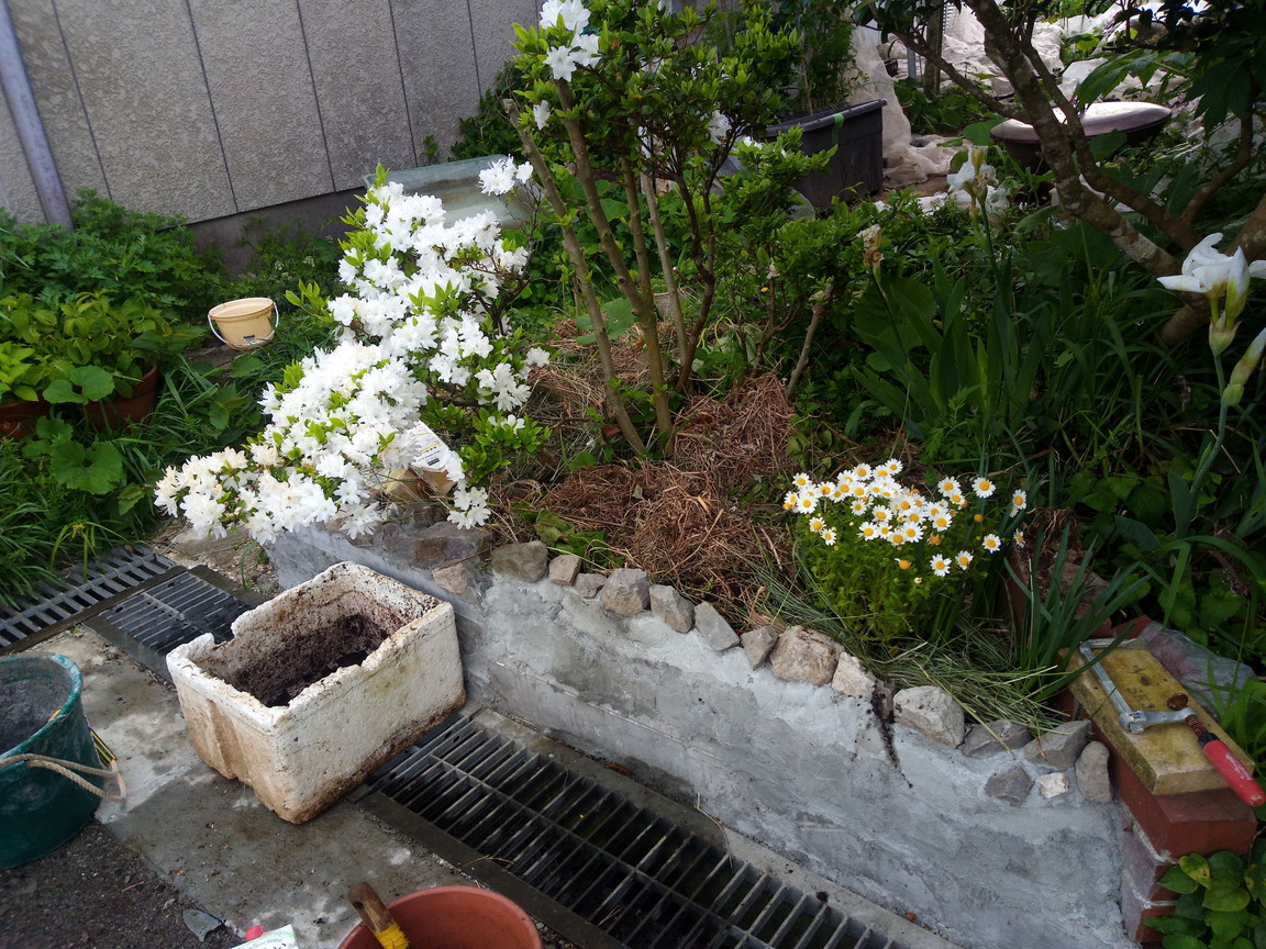 土を入れた部分には球根や宿根草、偶に一年草でも零れ種をおとすものを地植えや鉢植えで植えて行き、今度は土留めの、通路に沿った延長部分を作ります。お財布の関係で延長部分はかなり先の話になりますし、猫の出入り口が優先だなぁ。