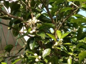 左: 夏蜜柑の花が開き始めました。香りが一番立つのは何時かしらね。