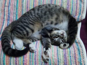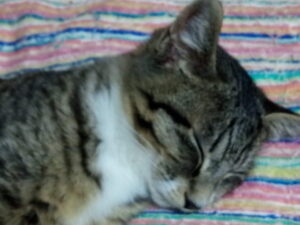 ちゃーちゃんが食事をした後、一階で休んでいました。仔猫の成長に合わせて休息をとっているのかな。ちゃーちゃんみたいな野良オカアサン猫には休む場所はないですよね。休息も大切だよね。三毛ちゃんが未だ来ていないですね。神出鬼没以上の三毛ちゃんだから氣にはしていないけど、来たら大声で鳴くからすぐわかります。