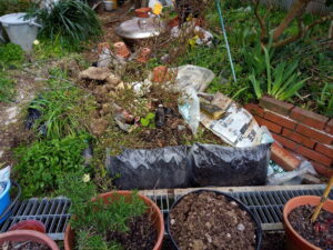 中: 2020年の1月の写真です。白躑躅の土留めを作る前、腐葉土の袋で土留めしていました。笑 白躑躅の土留めもすっかり見慣れてしまいましたが、こんな酷い状態だったのですねぇ。これじゃぁ、土は流れますよね。