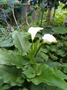 右: カラーの三番目の蕾も上がって来ました。