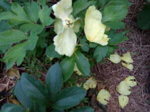 左: オリエンタルゴールドが散りました。猫でもぶつかったか、と思うような散り方です。昨日、Sさんに見て貰って良かったです。