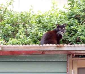 何回か往復して東の掃き出し窓から入ろうとしたら一階猫さんのカリカリを狙った白黒猫が忍び込み、それを刑事の様に尾行して来たタイガーさんとの闘いが一階で始まる処でした。窓から入って来た私を見て私の横を擦り抜けて逃げて行った白黒猫の腰骨にプラ柄杓でポッコン!、とお見舞い一発!左前足が負傷しているタイガーさんは果敢にも追いかけて行きました。無理するな~!